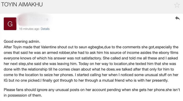 Below is the second mail: "Good evening admin. After Toyin made that Valentine shout out to seun egbegbe,due to the comments she got,especially the ones that said he was an armed robber,she had to ask him his source of income asides the ebony films everyone knows of which his answer was not satisfactory.