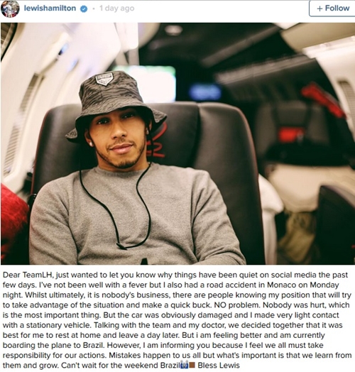 "Dear TeamLH, just wanted to let you know why things have been quiet on social media the past few days. I’ve not been well with a fever but I also had a road accident in Monaco on Monday night. Whilst ultimately, it is nobody's business, there are people knowing my position that will try to take advantage of the situation and make a quick buck. NO problem. Nobody was hurt, which is the most important thing. But the car was obviously damaged and I made very light contact with a stationary vehicle. Talking with the team and my doctor, we decided together that it was best for me to rest at home and leave a day later. But i am feeling better and am currently boarding the plane to Brazil. However, I am informing you because I feel we all must take responsibility for our actions. Mistakes happen to us all but what's important is that we learn from them and grow. Can't wait for the weekend Brazil 🙌🏾 Bless Lewis."