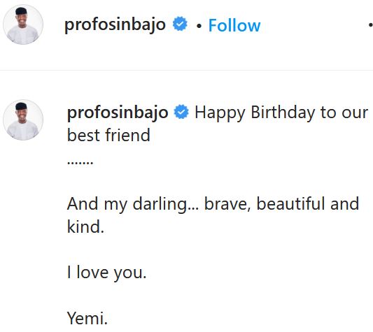 In a birthday message he posted online, the Vice President wrote: ''Happy Birthday to our best friend... And my darling... brave, beautiful and kind. I love you. Yemi.''