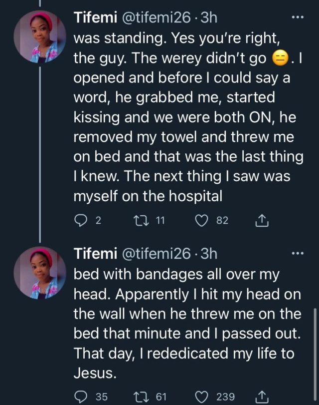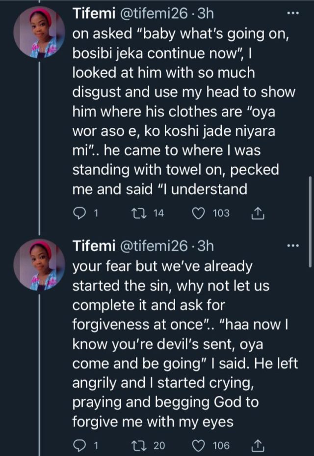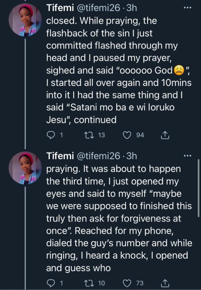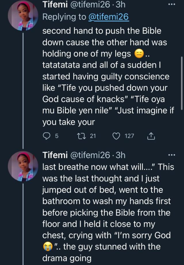 “I remembered one time I was committing sin on the bed with this guy and while at it, I made an eye contact with my Bible (cause it’s always on my bed) and I quickly turned my eyes away in fear like “Jesu mabinu oh, I’ll explain to you when I’m done Weary face”.. and I use my second hand to push the Bible down cause the other hand was holding one of my legs Expressionless face.. tatatatata and all of a sudden I started having guilty conscience like “Tife you pushed down your God cause of knacks” “Tife oya mu Bible yen nile” “Just imagine if you take your …”