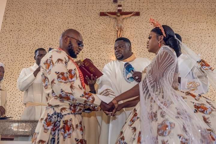 A Nigerian couple decided to be different by dressing in traditional Isiagu for their church wedding.