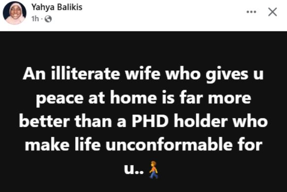 Yahya Balikis, a Nigerian lady, has sent out a message to Nigerian men about illiterate and educated women.