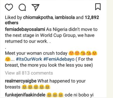 Colleague, Mercy Aigbe questioned the absence of his boobs which gave him away as a man.