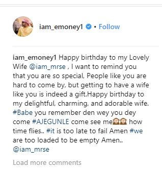 Showering her with encomium, he posted: "Happy birthday to my Lovely Wife @iam_mre , I want to remind you that you are so special, People like you are hard to come by, but getting to have a wife like you is indeed a gift.Happy birthday to my delightful, charming, and adored wife. #Babe you remember den wey you dey come #AJEGUNLE come see me how time flies.. #it is too late to fail Amen #we are too loaded to be empty Amen.. @iam_mrse"