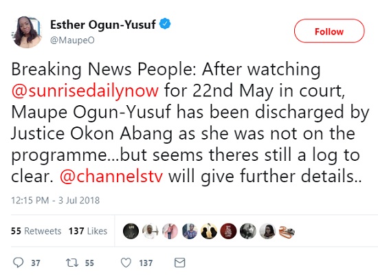 "Breaking News People: After watching @sunrisedailynow for 22nd May in court, Maupe Ogun-Yusuf has been discharged by Justice Okon Abang as she was not on the programme...but seems there's still a log to clear. @channelstv will give further details."