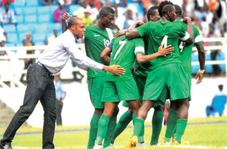 Coach Oliseh and Super Eagles players celebrate one of their goals against Niger in Port Harcourt