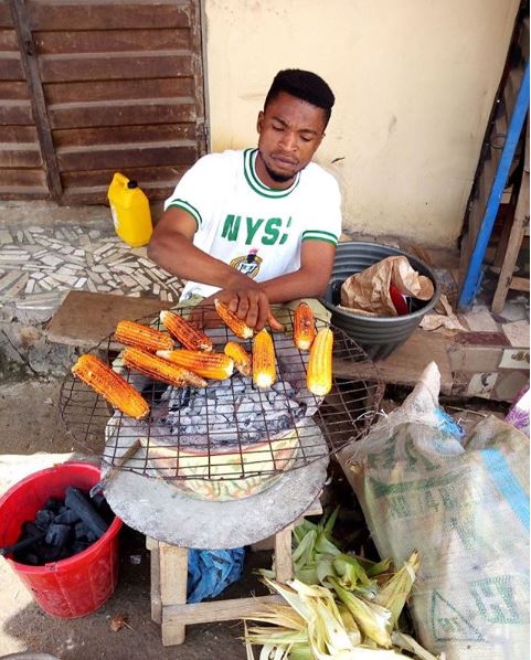 There have been different angles to this picture of a male participant of the National Youth Service Corp programme roasting corn on the street.