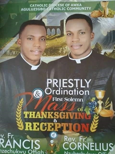 A Facebook user identified as Oluoma Assumpta, has taken to the social networking platform to share some pictures and story of how an identical twin brothers, Francis and Corenlius Offia, were recently ordained Catholic priests by the Bishop of Nnewi diocese Rev. Hilary Odili Okeke.