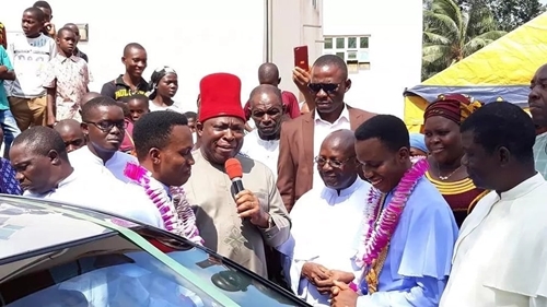 Senator Victor Umeh presenting the car to the new priests. (Photo: Senator Victor Umeh OFR/Facebook)