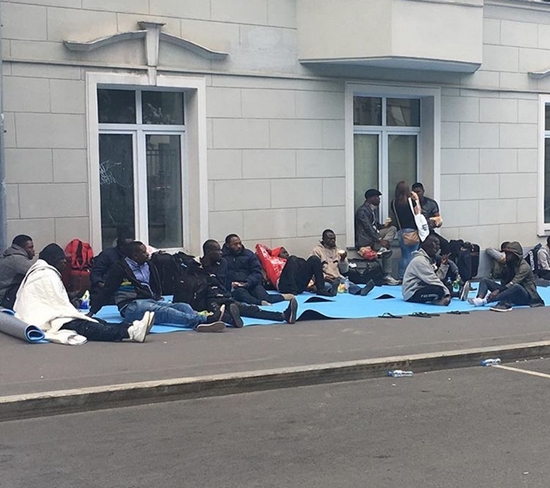 The stranded Nigerians were captured on camera sitting on a blue mat in front of the country's embassy in the European country.