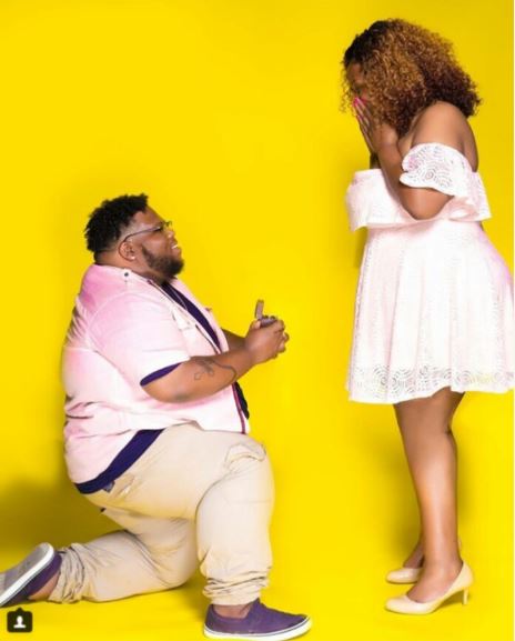 These are trending photos of a full-figured man kneeling down to make a marriage proposal to his beautiful lover.