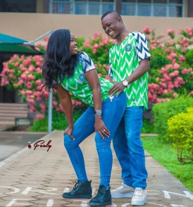 Another cute couple do the doggle-style pose as they rocked Super Eagles jersey in a pre-wedding photoshoot.