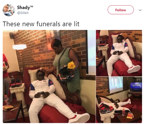 Some photos shared by a Twitter user, Shady (@6illeh), which is making the rounds online, show a dead teenager fully dressed in his preferred fashion style as he appeared to be lounging on a couch while holding an Xbox controller and sporting a pair of sunglasses with a giant TV facing him at his memorial.