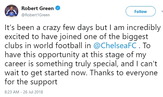 Chelsea Football Club has today, announced the completion of the signing of goalkeeper, Rob Green, who joins the club to provide backup for Thibaut Courtois and Willy Caballero after leaving Huddersfield Town, where he spent last season.