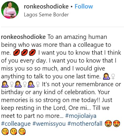 One of her closest friends, Ronke Oshodi recently shared a post as she remembered Moji who she revealed she misses a lot.