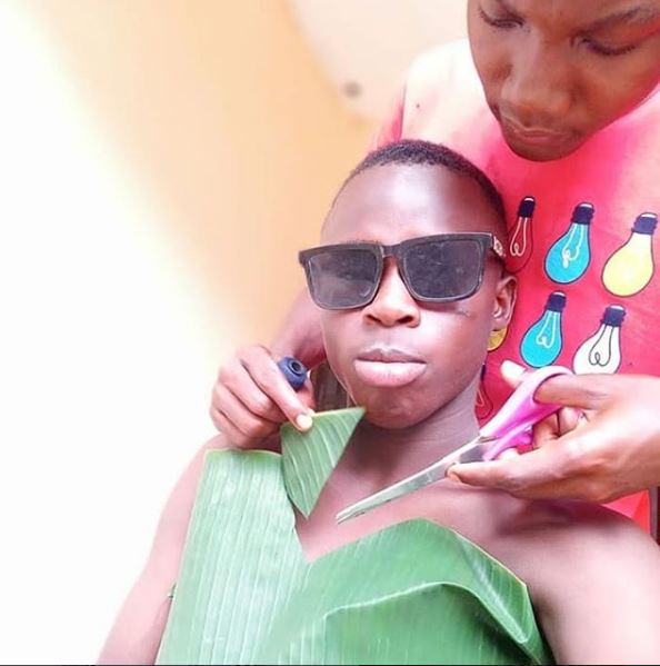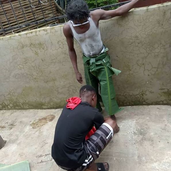 Toheeb painted his body with a white substance and also rocked plantain leaves in recreation of Toke Makinwa's green and white dress with shoes of a similar colour.