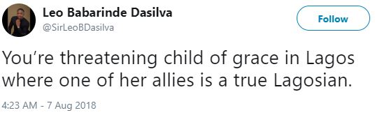 Leo wrote: "You’re threatening child of grace in Lagos where one of her allies is a true Lagosian.