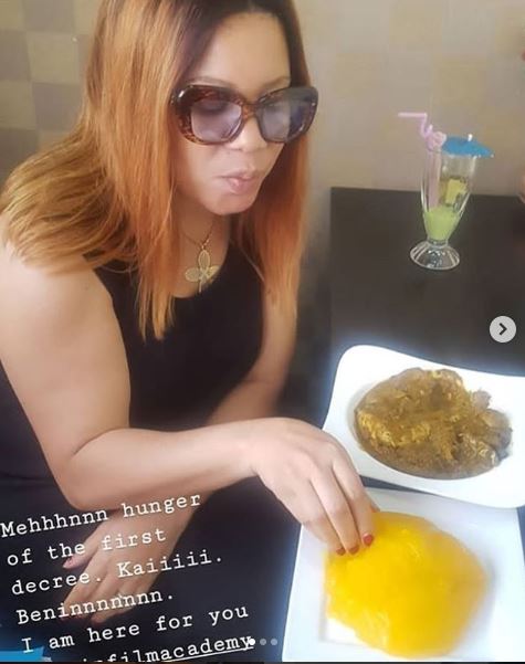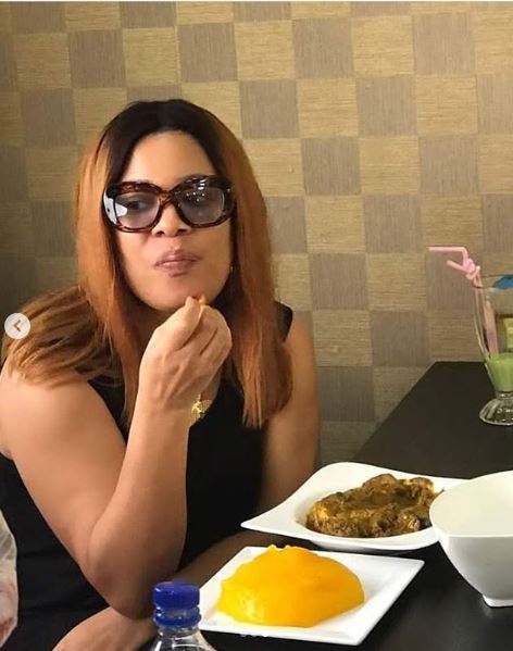 Light-skinned Nollywood actress, Monalisa Chinda was pictured munching some Banga soup and starch in Benin City, Edo State where she visited for a film work.