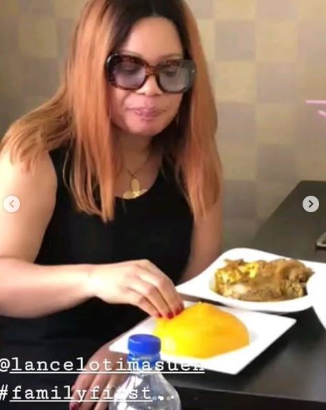 Monalisa Chinda was seen munching some Banga soup and Starch - a native food of the Edo people.