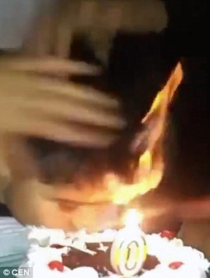 A young boy has set his hair on fire after he took a bite out of his birthday cake as he dove straight into his treat before blowing out the candle.