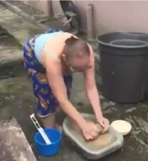 A white woman who was reportedly brought up in Nigeria was seen grinding pepper and tomatoes with the local grinding stone.