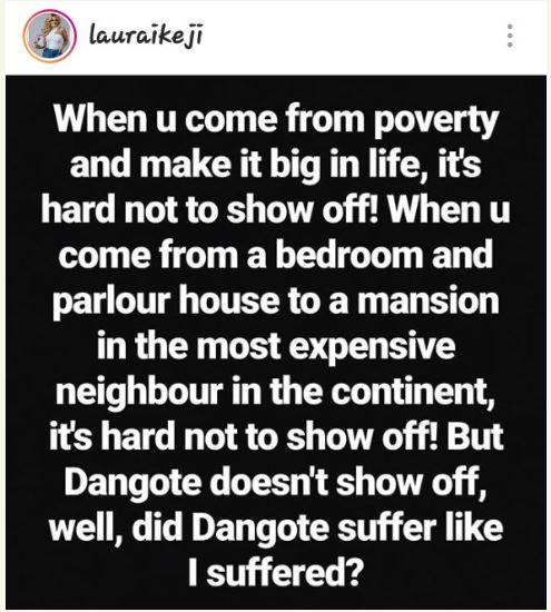 See what Laura Ikeji wrote; "When u come from poverty and make it big in life, it's hard not to show off! When u come from a bedroom and parlour house to a mansion in the most expensive neighbourhood in the continent, its hard not to show off! But Dangote doesn't show off, well did Dangote suffer like I suffered?"