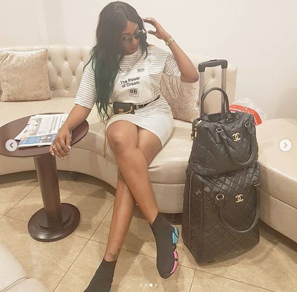 Actress, Oge Okoye who is blessed with an admirable height was pictured preparing to jet out of the country as she rocked a short gown.