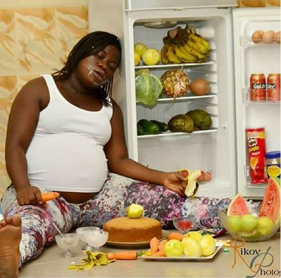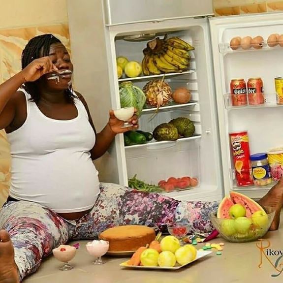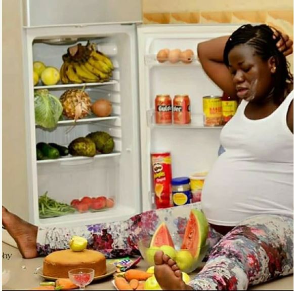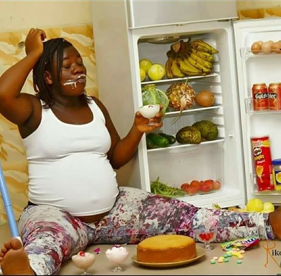 This was the message a woman explained pictorally in her maternity shoot. She was pictured taking some ice-cream, fruits, cake as well as having an open refrigerator filled with snacks, vegetables, and drinks by her side.