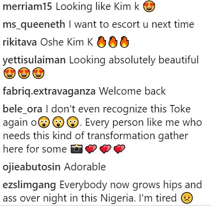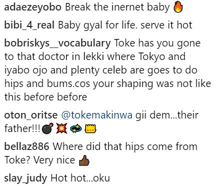 Some fans who fed their eyes with the photo, observed that Toke has suddenly become more curvy and had acquired more "hips".