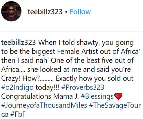 Using his Instagram page, TeeBillz has revealed how he told Tiwa Savage that she was going to be the biggest female act from of Africa.