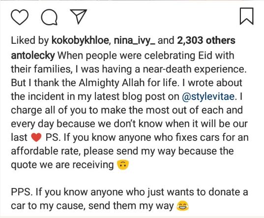 She wrote: "When people were celebrating Eid with their families, I was having a near-death experience. But I thank the Almighty Allah for life. I wrote about the incident in my latest blog post on @stylevitae. I charge all of you to make the most out of each and every day because we don’t know when it will be our last"