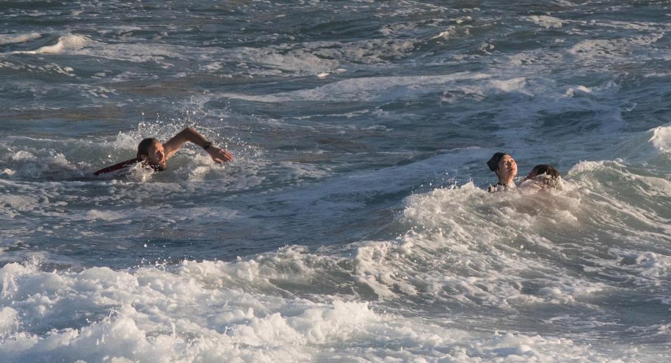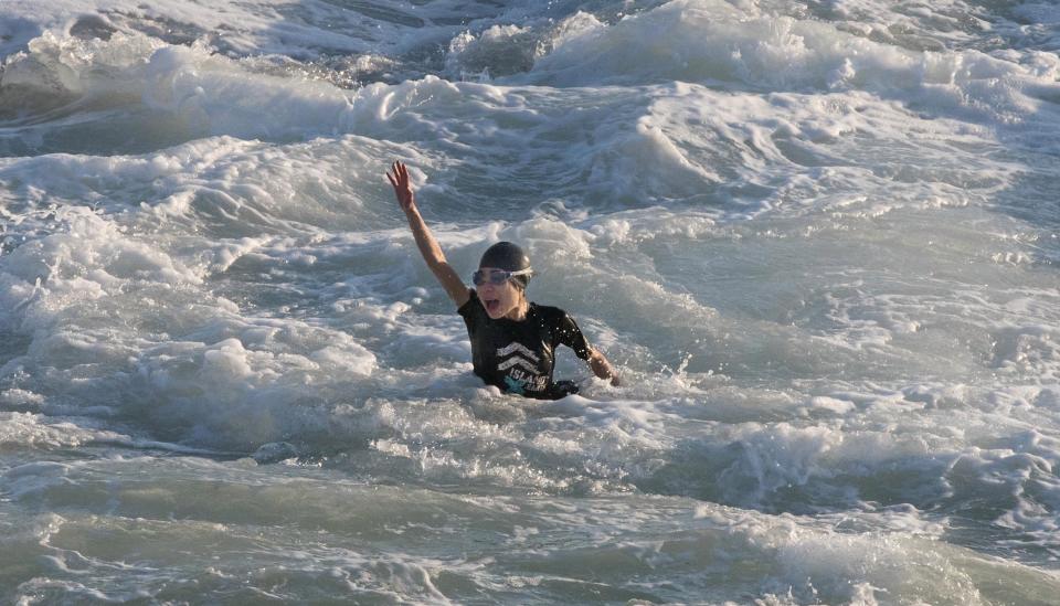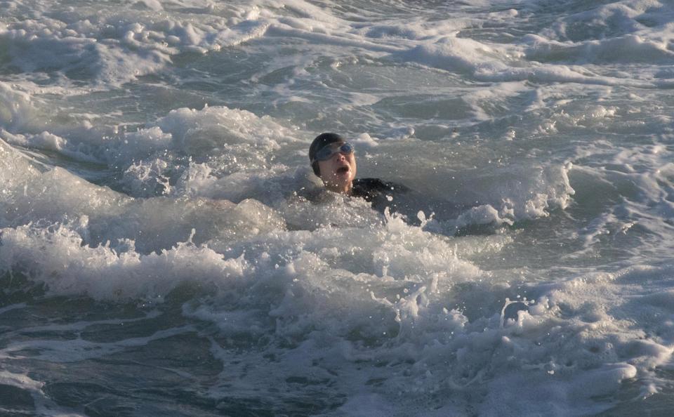 A woman struggles to keep her head above water during terrifying 10ft swells
