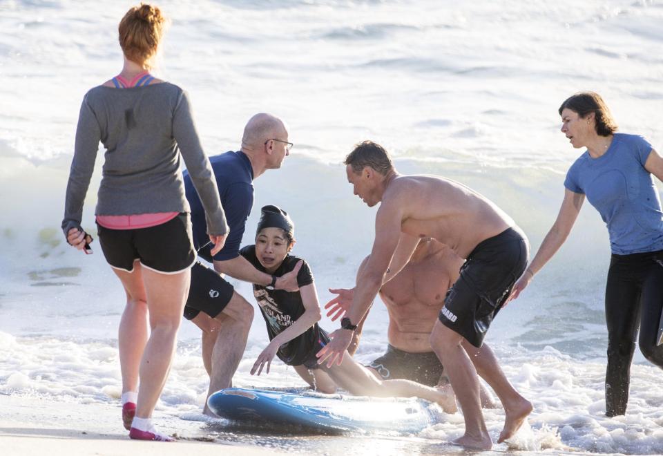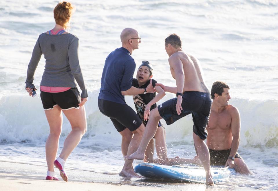 The lifeguards placed her on a surf board to take her back to shore