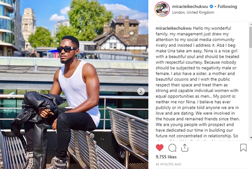 In a swift reaction to the online bashing Nina has since received, Miracle in his new Instagram post, said he nor Nina never came out to tell anyone they were dating.