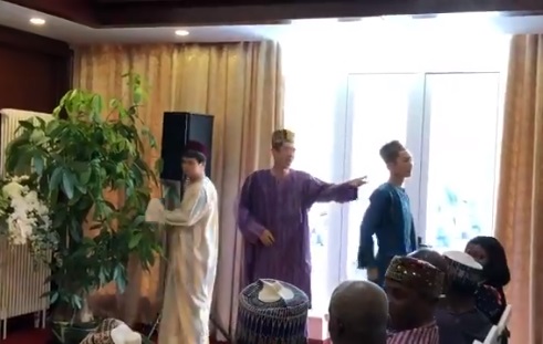 The video clip posted on social media, shows three Chinese men dancing 'Sai Baba' in full northern regalia during an event where Nigerians in diaspora hosted President Buhari in Beijing, China.