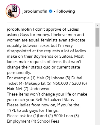 Celebrity relationship blogger and consultant, Joro Olumofin, has taken to his Instagram page to share his opinion on ladies who ask guys for money.