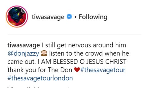 Sharing a video of when Don Jazzy came on stage on her recent London tour, she wrote; "I still get nervous around him @donjazzy listen to the crowd when he came out. I AM BLESSED O JESUS CHRIST thank you for The Don #thesavagetour #thesavagetourlondon"