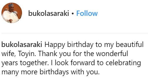 He wrote: "Happy birthday to my beautiful wife, Toyin. Thank you for the wonderful years together.