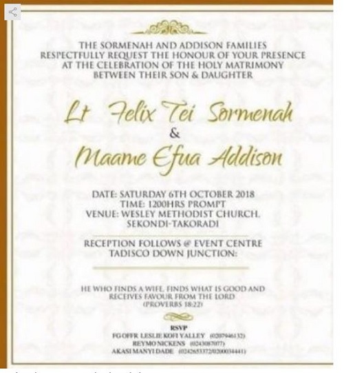“I took particular notice of him because he was busy moving up and down to ensure all things go well at my young sister’s wedding reception on April 28, 2018 Lt. Felix Tei Sormenah, a friend of my sister’s husband, was a reflection of what true friendship was on that day It was all joy when he turned up with his fiance at my residence the following day after church service for lunch Lt.