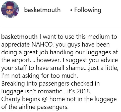 Basketmouth isn't happy that these guys are still breaking into luggage belonging to travelers and stealing from them. He made his dissatisfaction on his Instagram page on Tuesday, September 11, 2018.