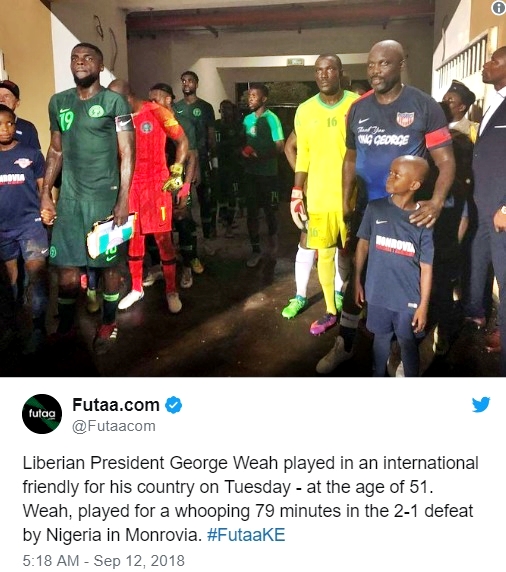 The 51-year-old President of Liberia, George Weah, on Tuesday night, made a surprise return to international football in Monrovia, playing for 79 minutes in a 2-1 friendly loss to Nigeria a few weeks short of his 52nd birthday.