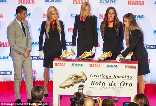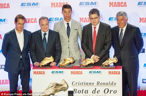 Perez (2nd left) poses with Ronaldo (centre) and club officials in front of his four Golden Boot awards