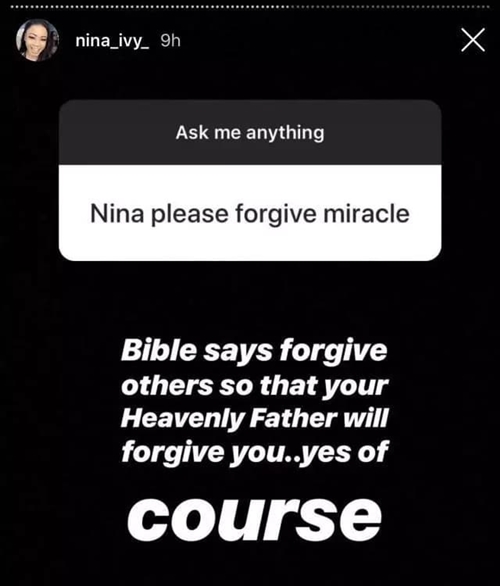 Nina's fan had pleaded with her to forgive Miracle, and in a swift response to the question, Nina said that she had forgiven the handsome pilot.