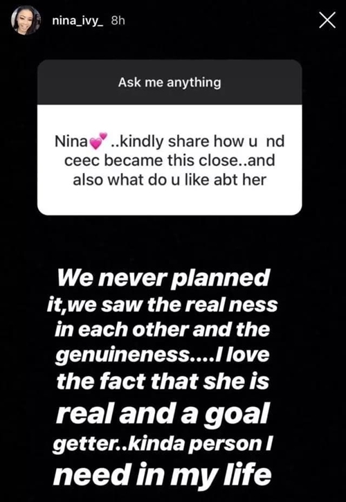 Nina also talked about her relationship with yet another BBNaija contestant, Cee-C, and the unexpected bond they had come to have. This line of conversation was prompted once more by a fan.