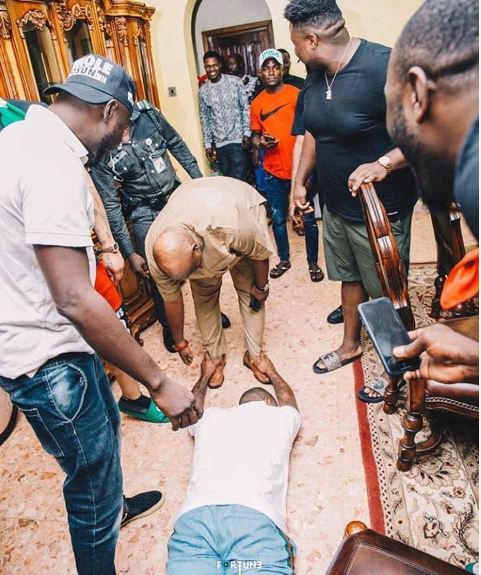 In new photos which have emerged on social media, Davido is once again, seen displaying the respect he has for Ademola Adeleke. The pop star is seen lying flat on his face before his uncle whom he now fondly calls 'the next governor of Osun state.