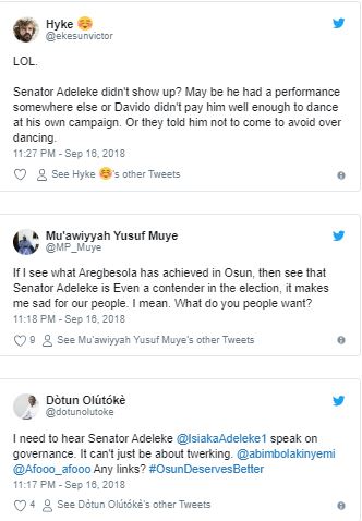 After the news of Adeleke’s absence hit the waves, Twitterati lashed on it to question whether the candidate really has anything to offer the people of the state, except tagging on the popularity of his senior brother, Isiaka, also a former senator.