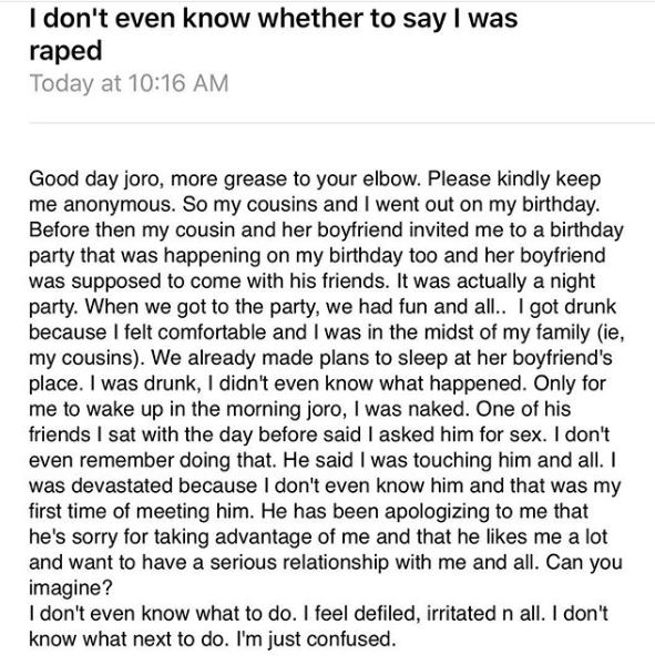 A young lady who is confused about being r*ped has written her story to a relationship blogger and online psychologist, Joro Olumofin.