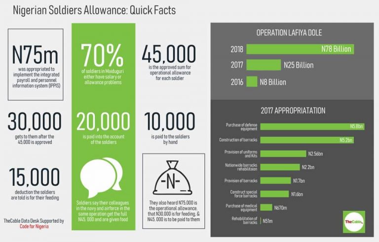 For each soldier fighting insurgency, N45,00, they understand, is the approved sum for operational allowance. But, of this approved sum, N30,000 is what eventually gets to them. N20,000 is paid into their account, and N10,000, a hand-to-hand payment. A deduction of N15,000, the soldiers are told, is used for their feeding.