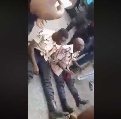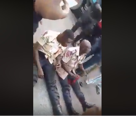 In a video shared online, the uniformed men are seen sitting on the floor, in the middle of the road as the angry mob kicked them and ignored their pleas.