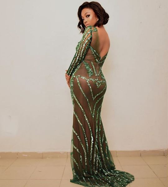 Toke's first dress was a revealing green evening gown with mesh inserts from designer Tope FnR. The dress, which was for the most part, see-through, was a floor length green evening dress with sequin accents. Toke paired it with a wavy bob and natural looking makeup making the dress the star of the look. She posed up a storm with co-host IK Osakioduwa as they prepared to hit the stage.